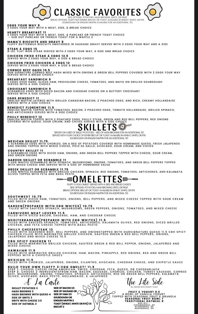 A generous portion of scrambled eggs, hash browns, bacon, sausage and blacked beans wrapped in a large flour tortilla topped with our signature queso, pico de gallo, avocado, sour cream and green onions with a side option
