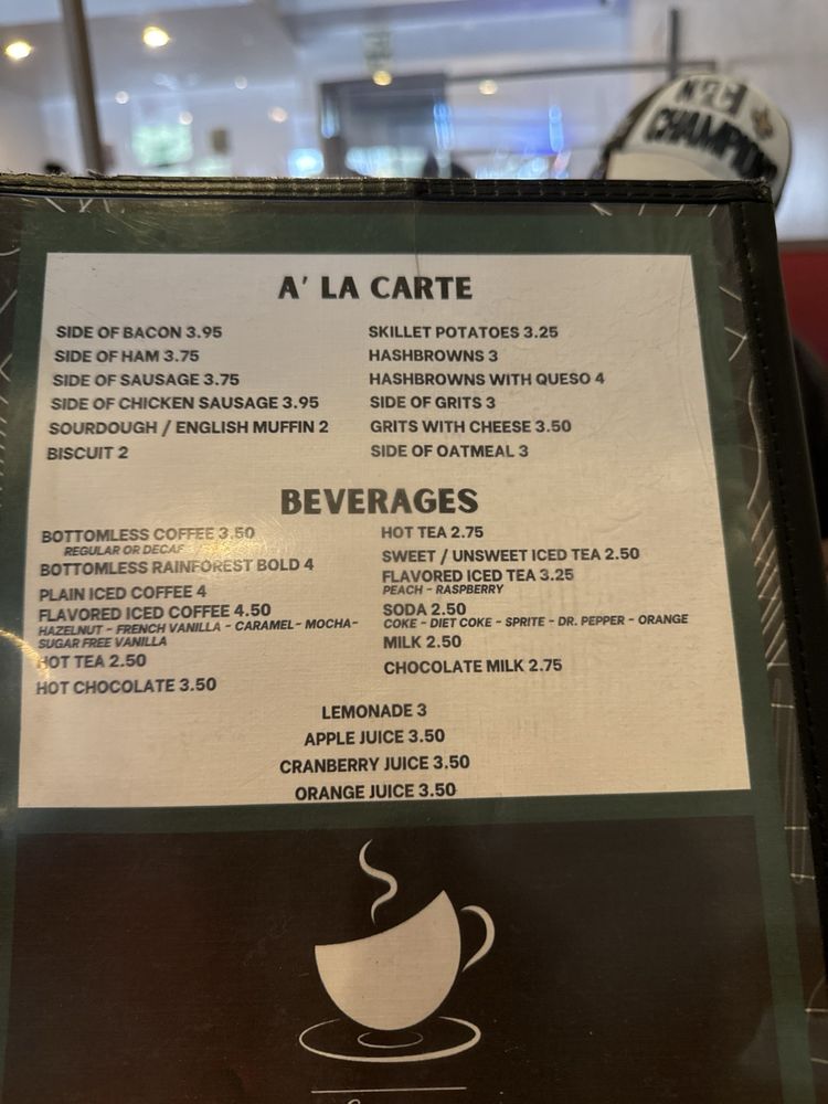 Eggs your way with a meat, side and pancake or French toast choice - sub out pancake or French toast for a waffle for dollars