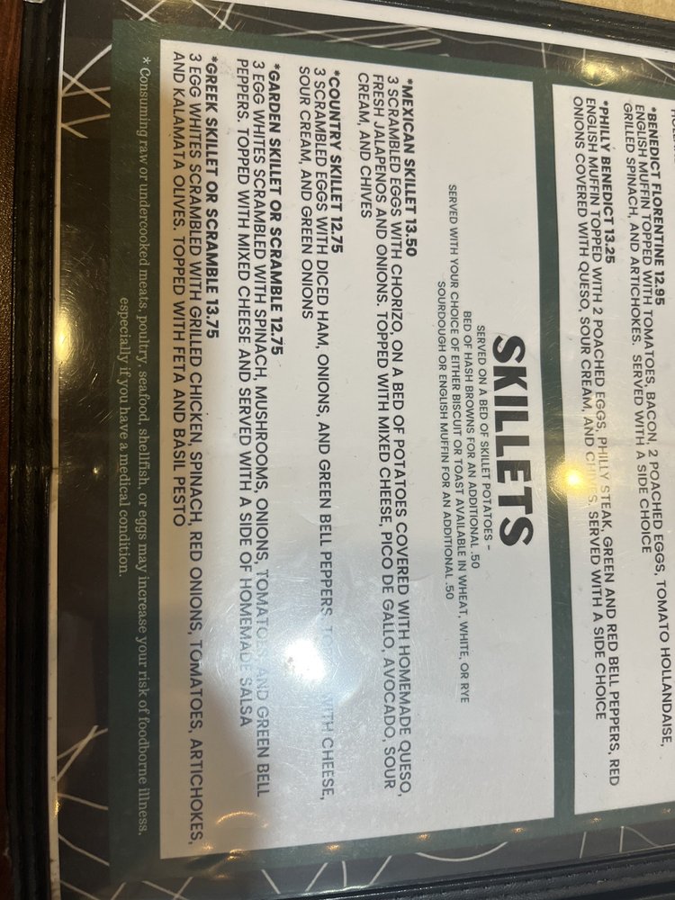 English muffin topped with poached eggs, philly steak, green and red bell peppers, red onions covered with queso, topped with sour cream and chives served with a side choice